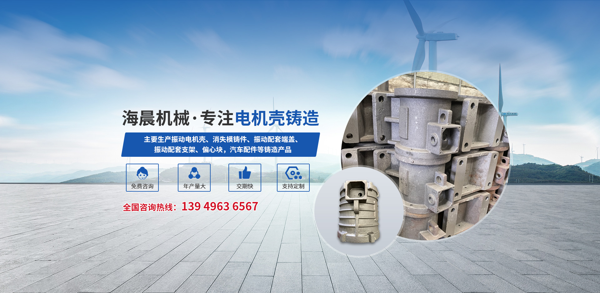新鄉縣海晨機械有限公司,始建于1996年,我公司擁有垂直造型生產線,年設計產量5萬噸,主要生產振動電機殼、消失模鑄件、振動配套端蓋、振動配套支架、偏心塊,汽車配件等鑄造產品,公司占地面積1500平方米,現有員工100余人,其中工程師5名,技工12名,固定資產1500萬,擁有生產設備60多臺(套)。我們遵循“團結、敬業、創新”的敬業精神,始終堅持以技術為后盾,以質量求發展,以客戶需求為己任,不斷致力......